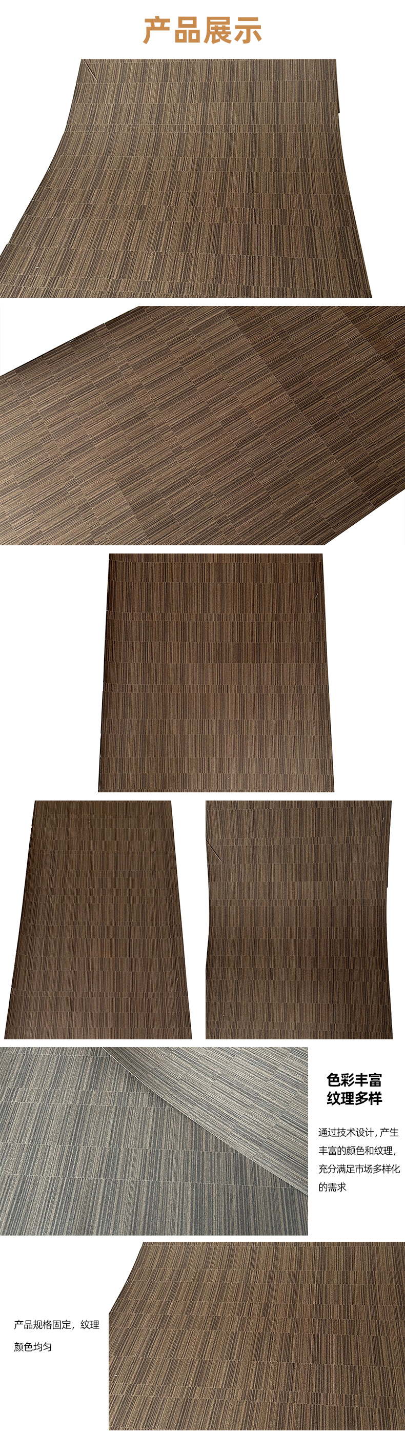 科技木皮其纹理及色泽的规律性、使用规格尺寸的一致性。在使用过程中不会产生天然木皮产品由于原木不同、造成不同批次的纹理差异、色泽差异,产生难以拼接的烦恼。
