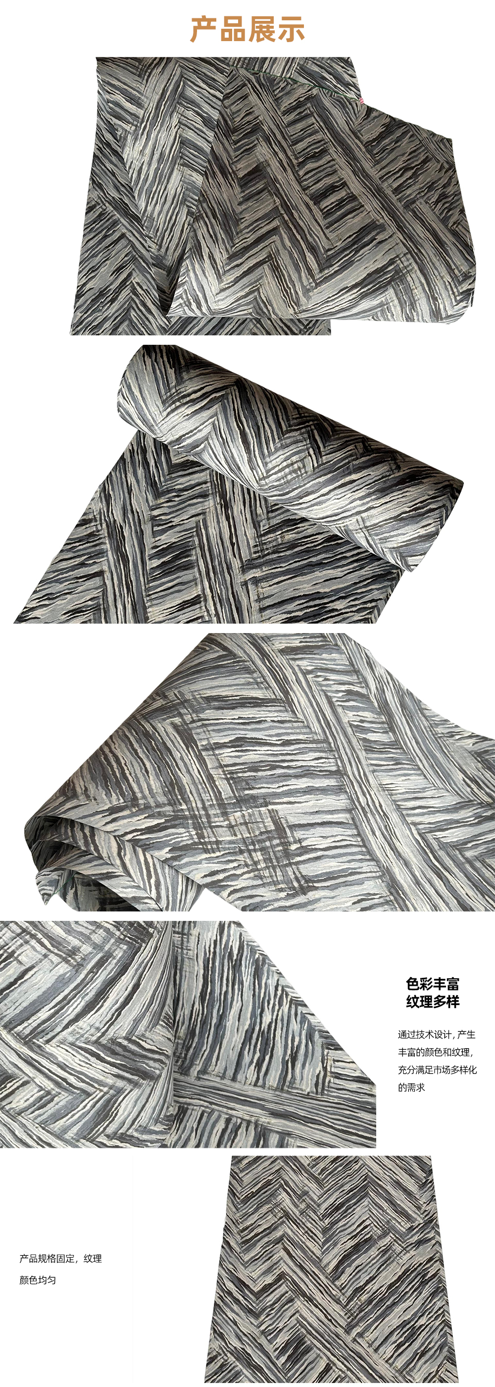 科技木皮其纹理及色泽的规律性、使用规格尺寸的一致性。在使用过程中不会产生天然木皮产品由于原木不同、造成不同批次的纹理差异、色泽差异,产生难以拼接的烦恼。