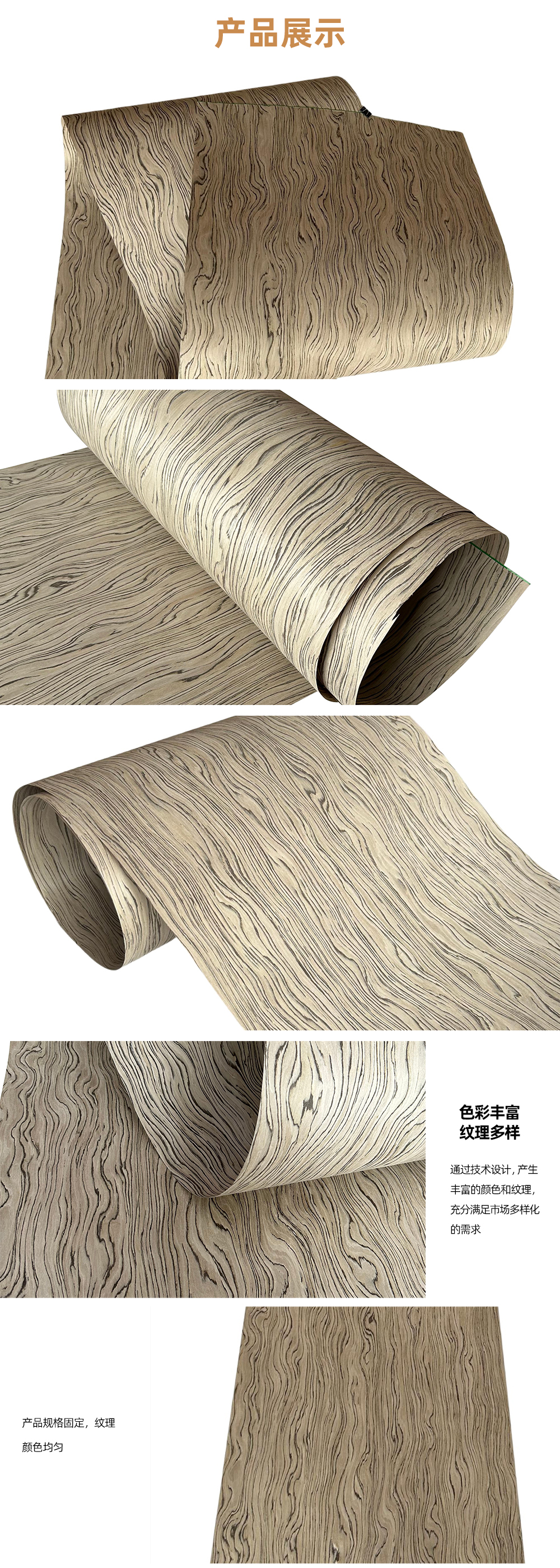 科技木皮其纹理及色泽的规律性、使用规格尺寸的一致性。在使用过程中不会产生天然木皮产品由于原木不同、造成不同批次的纹理差异、色泽差异,产生难以拼接的烦恼。