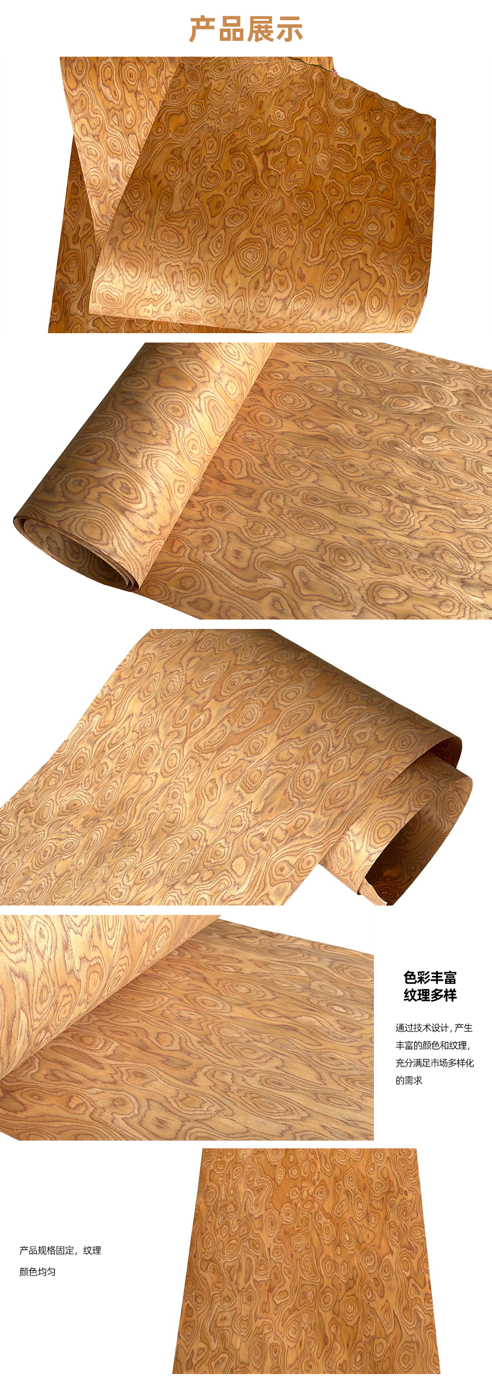 科技木皮其纹理及色泽的规律性、使用规格尺寸的一致性。在使用过程中不会产生天然木皮产品由于原木不同、造成不同批次的纹理差异、色泽差异,产生难以拼接的烦恼。
